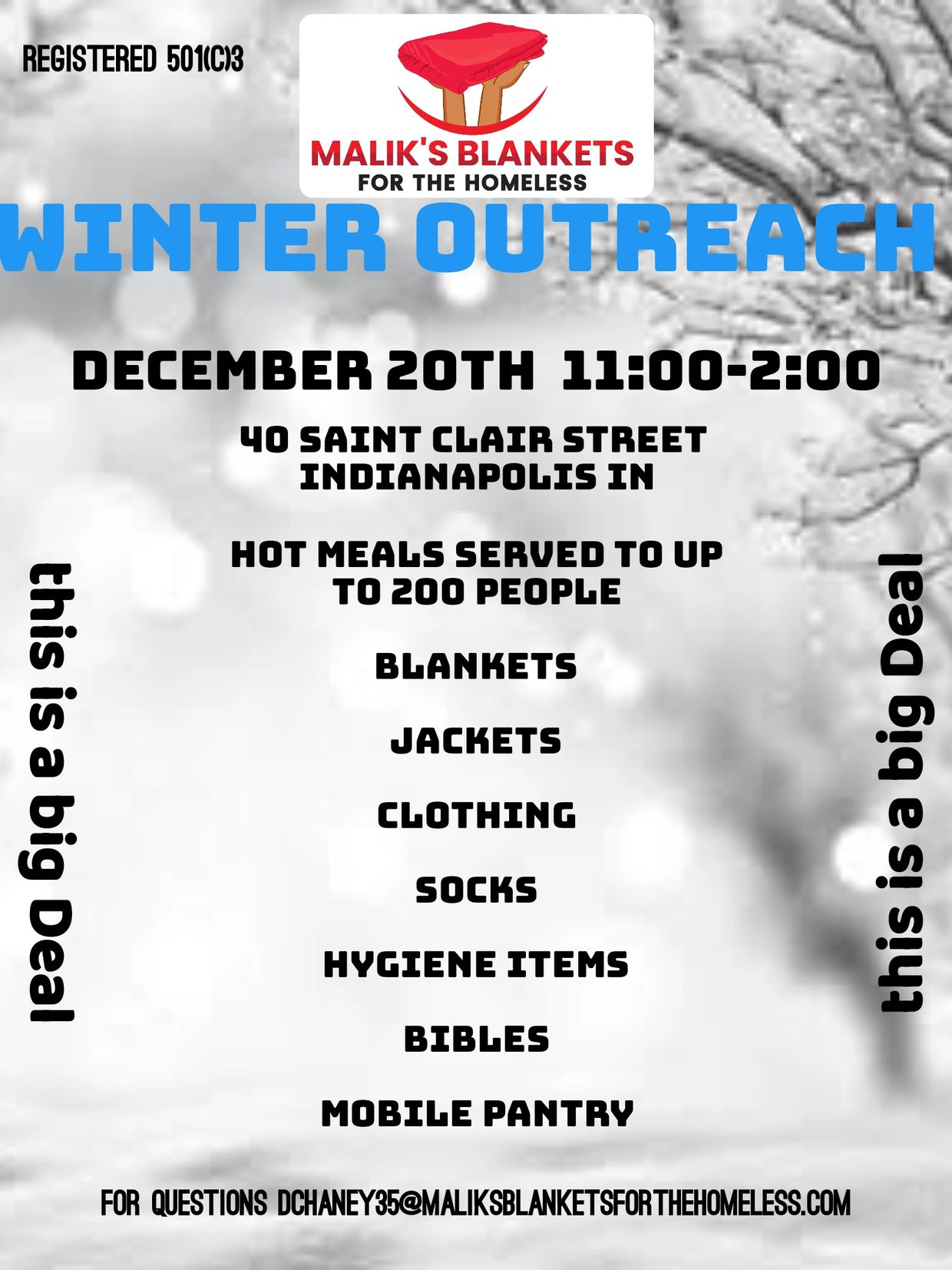 📢 Malik's Blankets for the Homeless Outreach on February 10th, 2024, in Indianapolis! We'll be distributing Outreach bags packed with non-perishable food items, hygiene essentials, hand warmers, a bottle of water, and a book sharing the teachings of Jesus. Let's make a difference together. Make a donation today